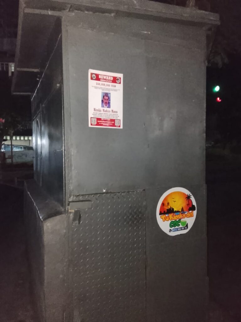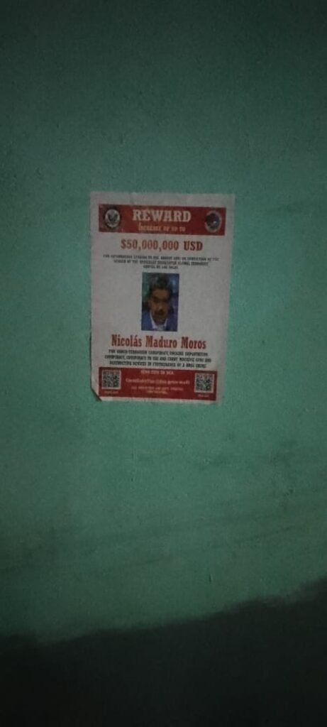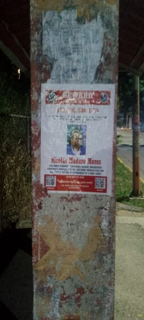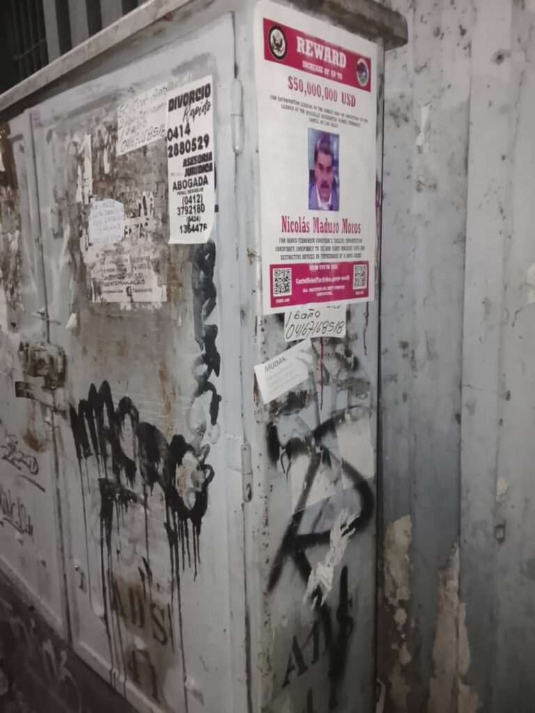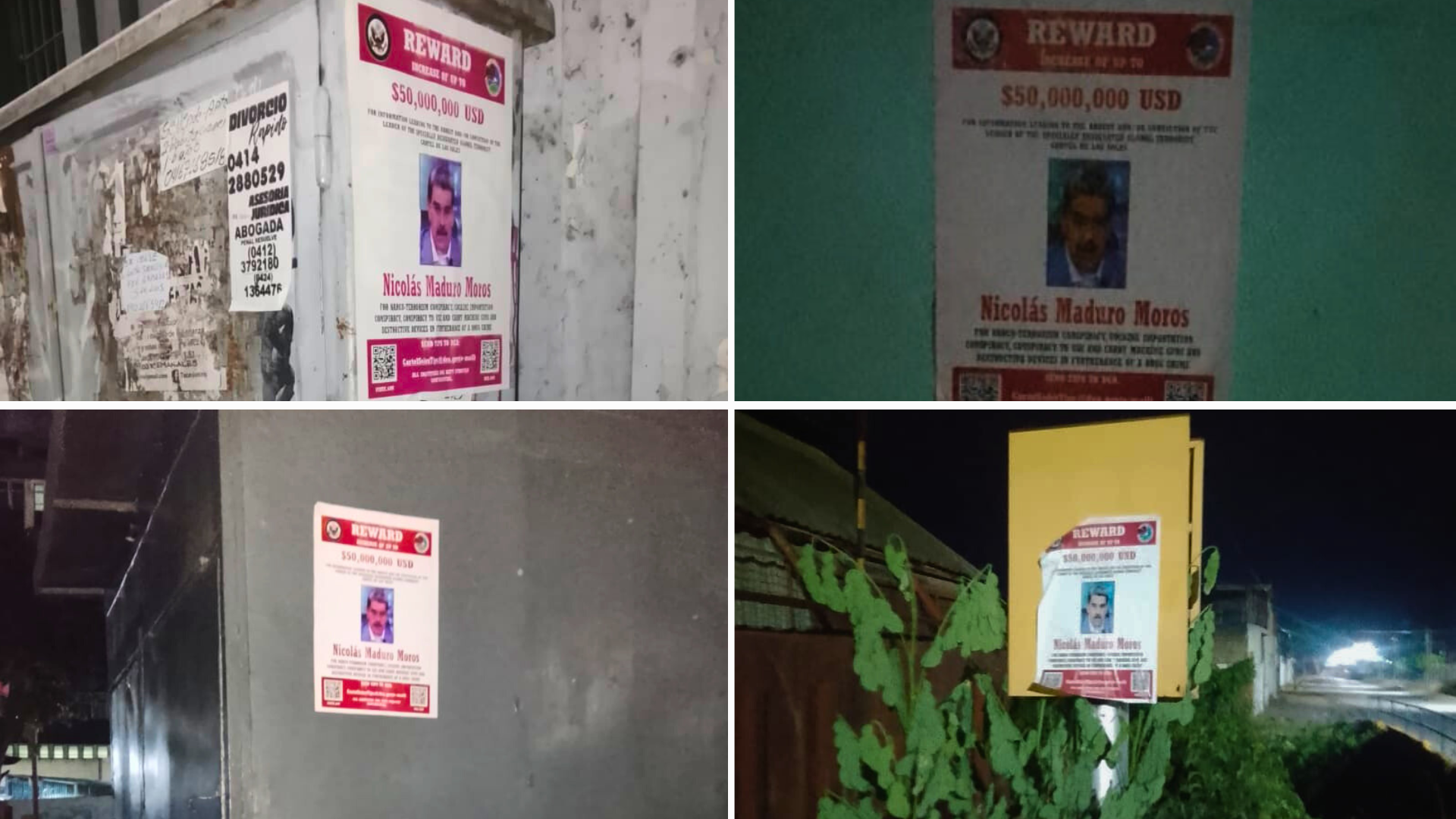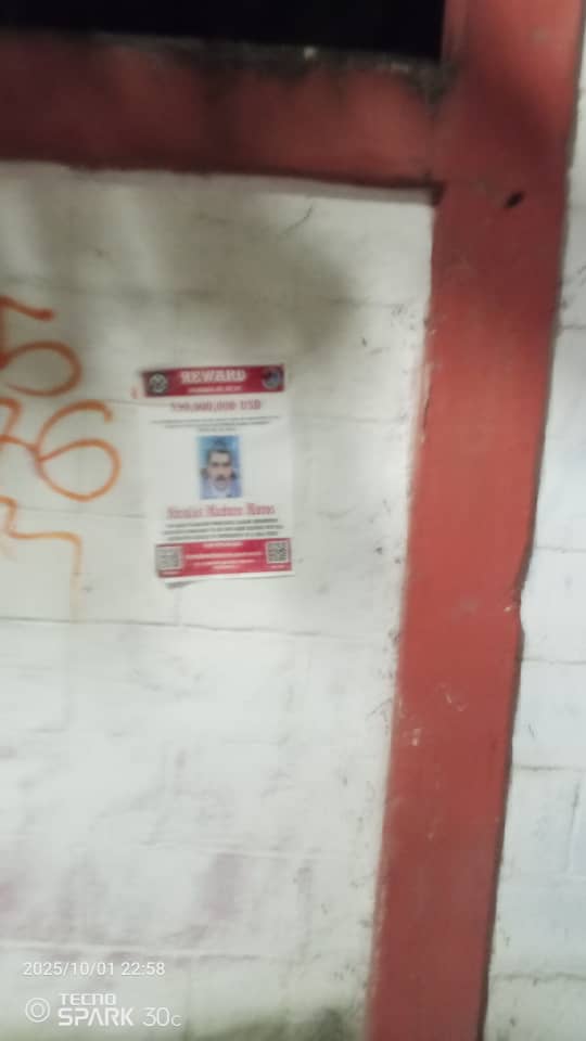 La madrugada de este jueves 2 de octubre, diversos sectores de Caracas, San Cristóbal, Vargas, Guárico y Lara amanecieron empapelados con carteles alusivos a la recompensa de 50 millones de dólares contra Nicolás Maduro, ofrecida por el gobierno de Estados Unidos.