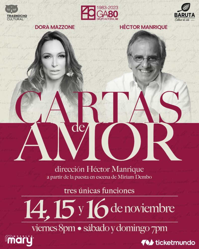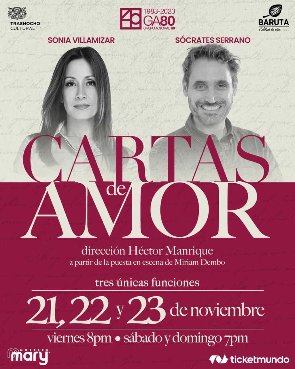 Regresa a la sala del Teatro Trasnocho la aclamada obra “Cartas de Amor”, original del dramaturgo estadounidense A. R. Gurney, todo un clásico moderno bajo la producción del Grupo Actoral 80 y que estará solo por dos semanas en cartelera con doble elenco, los días 14, 15 y 16 de noviembre con Dora Mazzone y Héctor Manrique, y el 21, 22 y 23 de noviembre con Sonia Villamizar y Sócrates Serrano.
