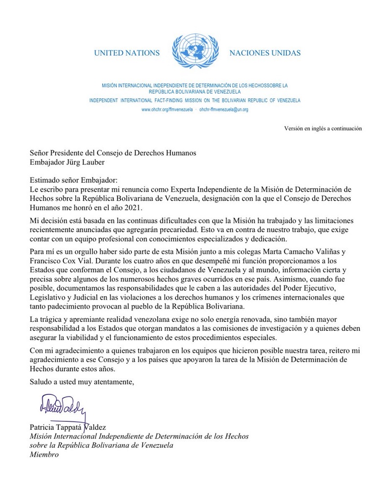 Francisco Cox Vial y Patricia Tappatá Valdez, ambos integrantes de la Misión de Determinación de Hechos sobre Venezuela de la Organización de Naciones Unidas (ONU) presentaron su renuncia al equipo de investigación.