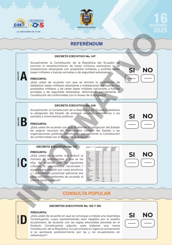 Las otras dos preguntas propuestas por Noboa contemplan la reducción del número de integrantes de la Asamblea Nacional (Parlamento) de 151 a 73 representantes y la eliminación de la financiación pública a partidos políticos, de modo que solo puedan financiarse con recursos privados.