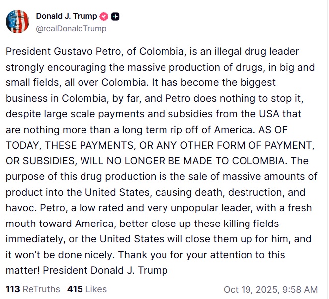 Trump anunció además la suspensión inmediata de los pagos o subsidios de Washington hacia Bogotá, al calificar dichos apoyos como una “estafa a largo plazo”. Según su declaración, el propósito de la producción de drogas en Colombia es la exportación masiva hacia Estados Unidos, lo que —según dijo— ha generado graves consecuencias en territorio estadounidense.