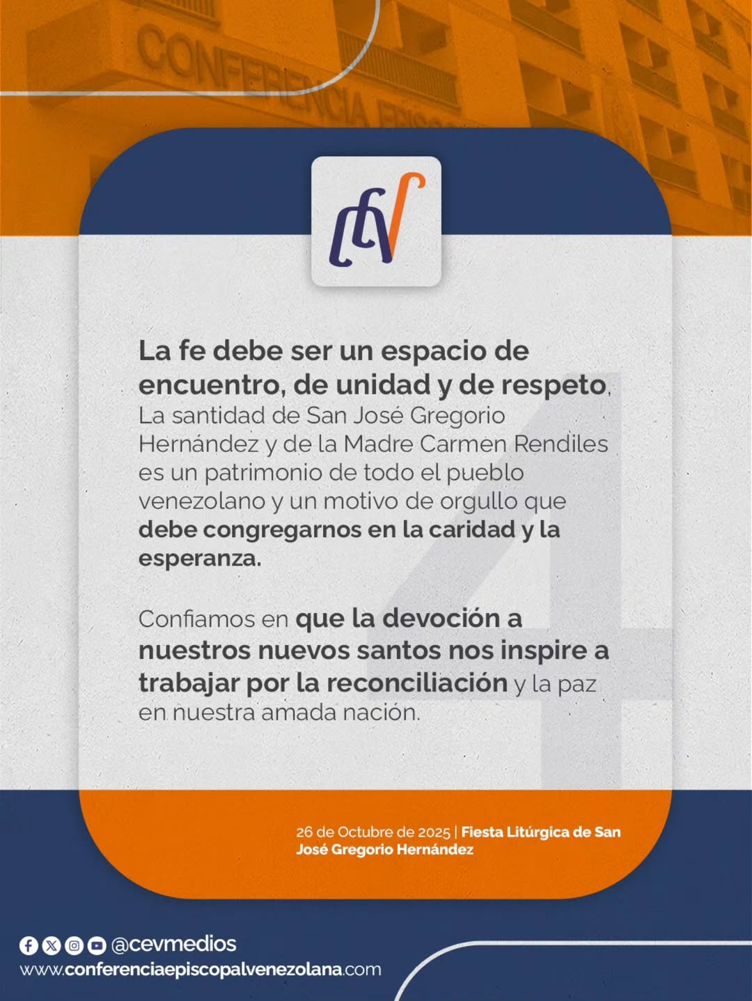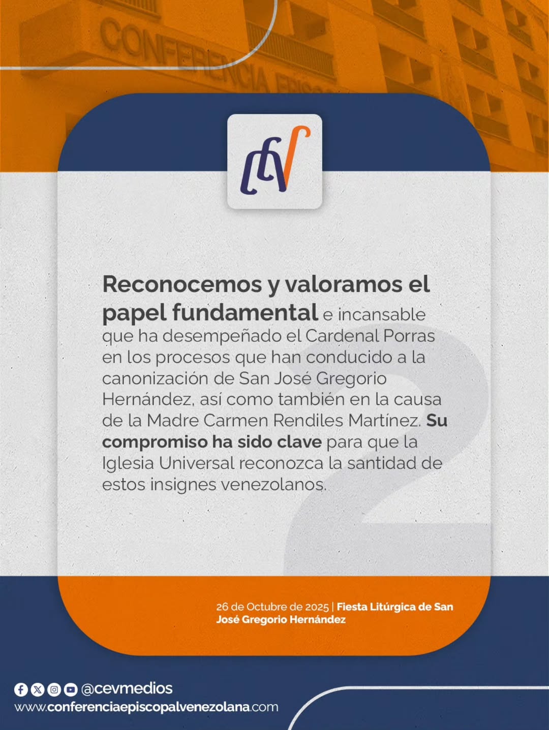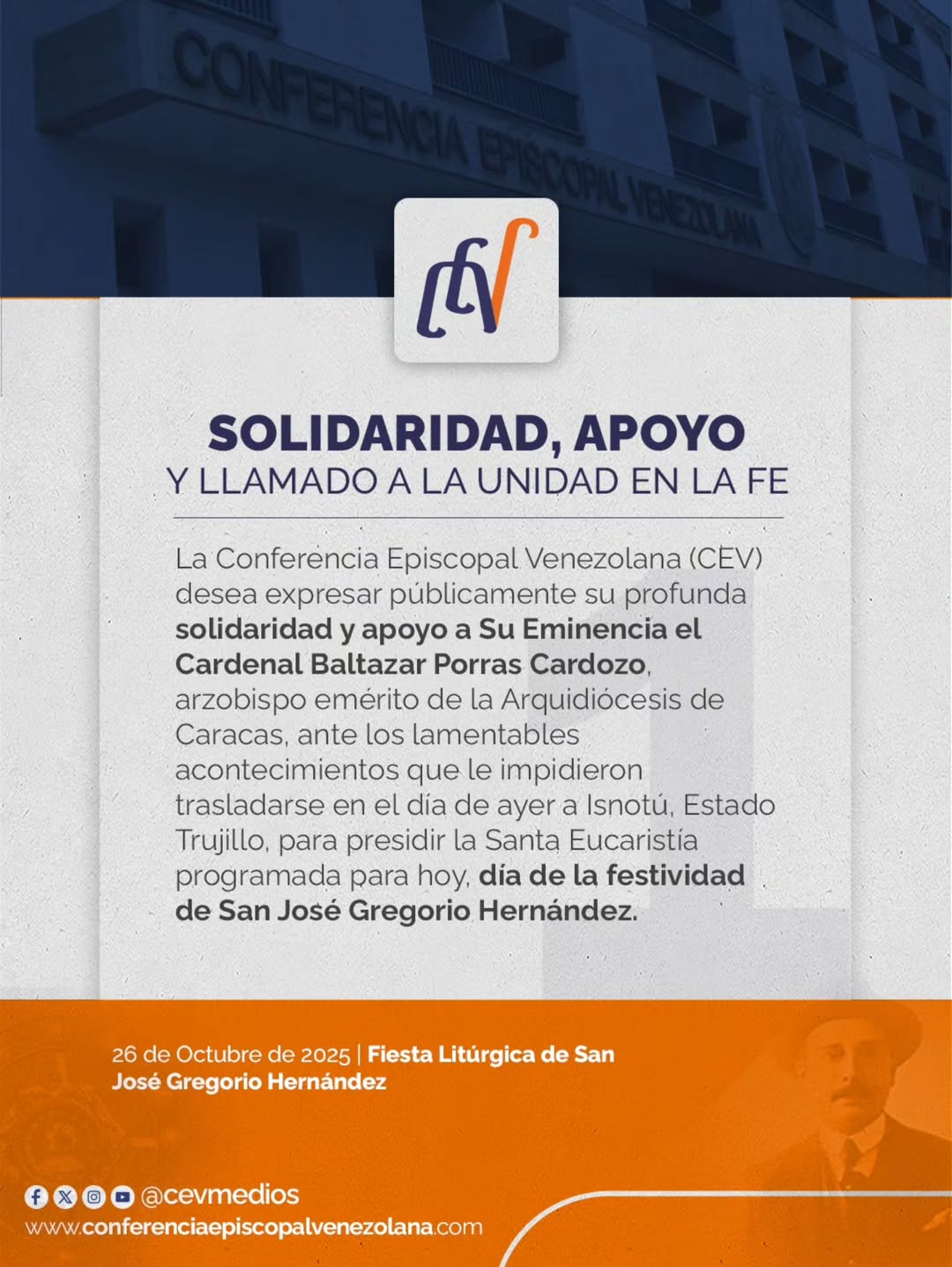 La Conferencia Episcopal Venezolana (CEV) emitió un comunicado en el que manifiesta su apoyo y solidaridad al cardenal Baltazar Porras Cardozo, tras el impedimento del régimen de Nicolás Maduro para trasladarse a Isnotú y presidir la misa en honor a San José Gregorio Hernández.