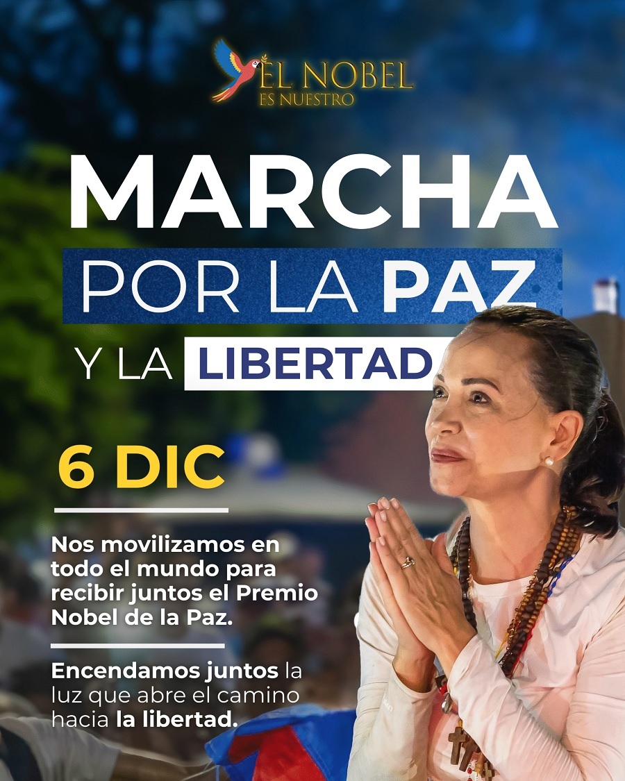 El partido Vente Venezuela (VV) anunció este viernes la convocatoria a una marcha mundial por la libertad el próximo 6 de diciembre, cuatro días antes de la entrega, en Noruega, del Premio Nobel de la Paz concedido este 2025 a la líder opositora María Corina Machado.