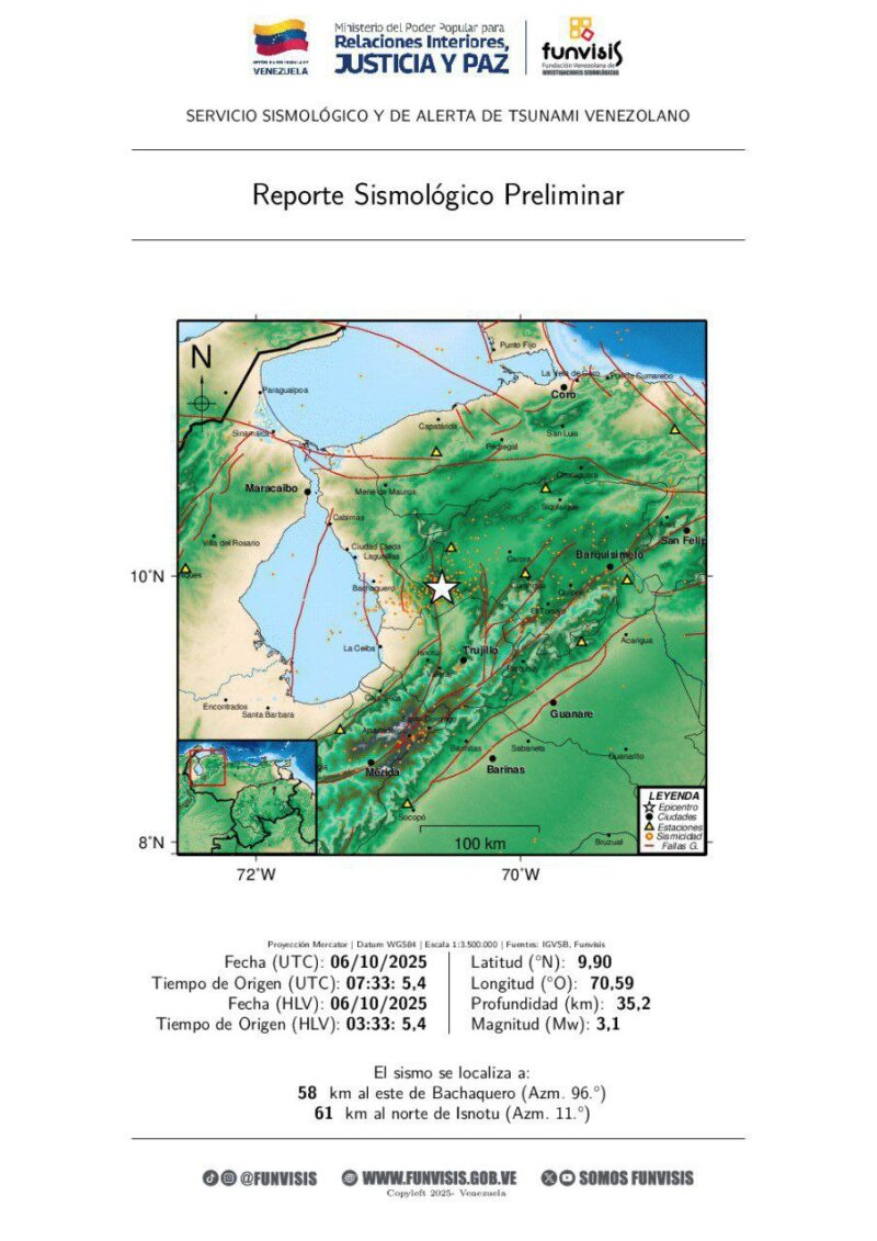 A las 3:33 am se registró el tercer sismo de magnitud 3.1, profundidad 35.2 km, y epicentro a 58 km al este de Bachaquero (Zulia).
