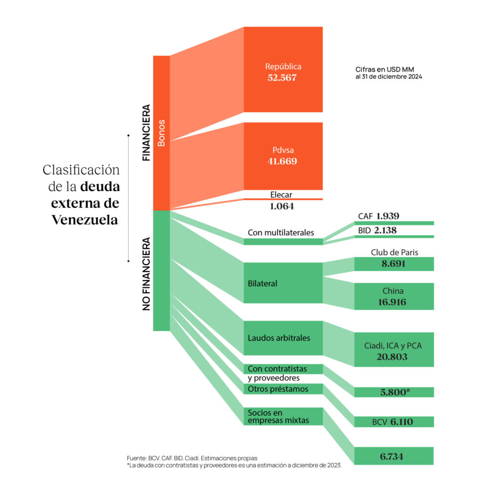 Por otro lado, la deuda no financiera de Venezuela ronda los USD 69.131 millones de dólares o 42%. Aquí se incluyen, entre otras, las deudas adquiridas con bancos multilaterales; con otros países a partir de acuerdos bilaterales; con empresas privadas socias en empresas mixtas, así como con firmas multinacionales que operaban en Venezuela, cuyos activos fueron expropiados o confiscados y terminaron demandando en cortes internacionales.