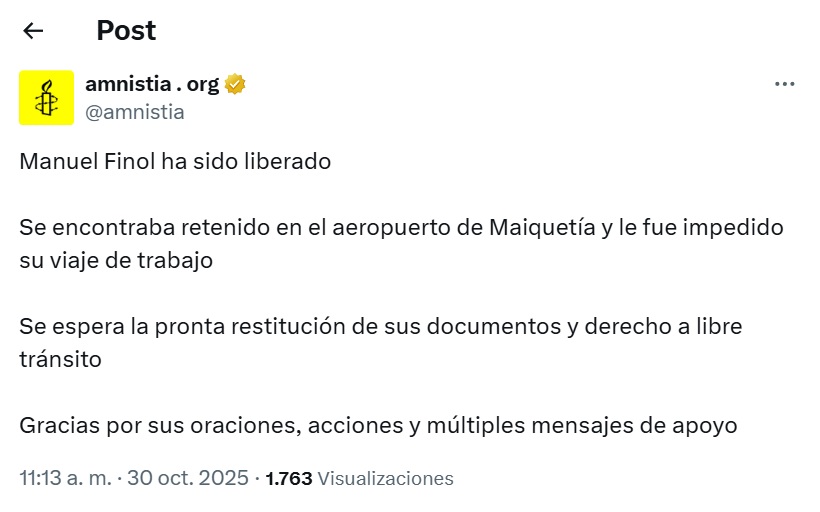 «Manuel Finol ha sido liberado. Se encontraba retenido en el aeropuerto de Maiquetía y le fue impedido su viaje de trabajo. Se espera la pronta restitución de sus documentos y derecho a libre tránsito», informó la ONG en su cuenta oficial en la red social X.